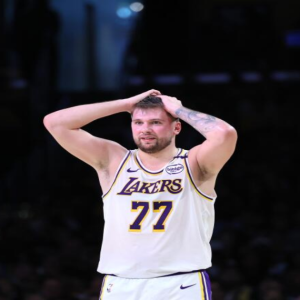 Lakers guard Luka Doncic (77) scored 37 points in a losing effort against the Timberwolves at Crypto.com Arena Saturday. (Allen J. Schaben/Los Angeles Times) Lights, camera … freeze? What was…