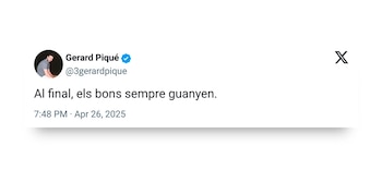Gerard Piqué, ex referente del Barcelona y una figura siempre influyente en los Clásicos, no tardó en reaccionar a la victoria de su ex equipo. A través de su cuenta en X, la red social anteriormente conocida como Twitter, Piqué compartió un polémico mensaje: “Al final, los buenos siempre ganan”. La publicación, escrita en catalán, fue interpretada como un dardo al eterno rival, el Real Madrid, y rápidamente se viralizó entre los aficionados culés que celebraban el título compartiendo imágenes de la celebración en el estadio sevillano.