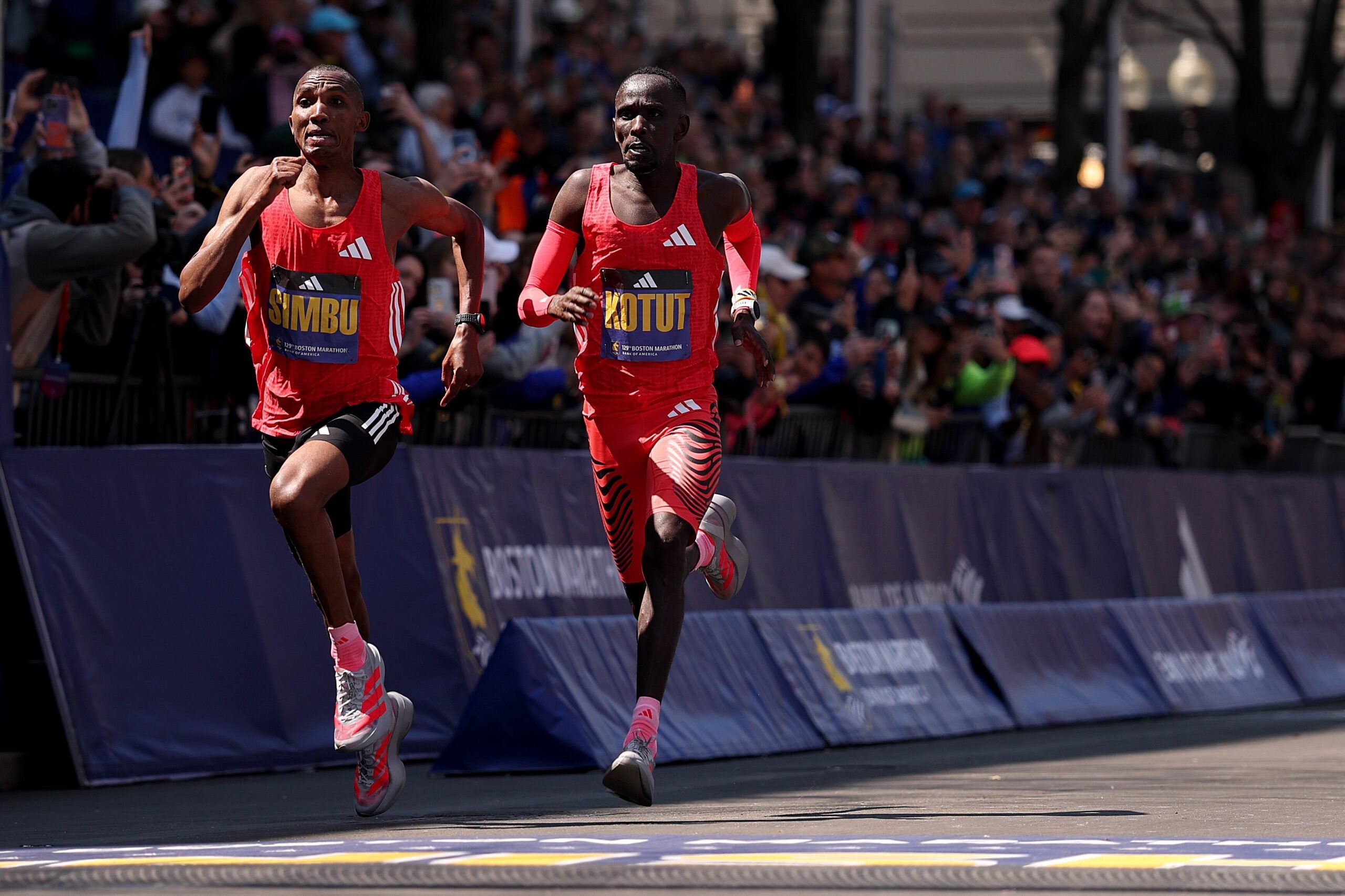Alphonce Felix Simbu of Tanzania finishes in second place next to Cybrian Kotut of Kenya in third during the running of the 129th Boston Marathon on April 21, 2025 in Boston, Massachusetts. – Maddie Meyer/Getty Images