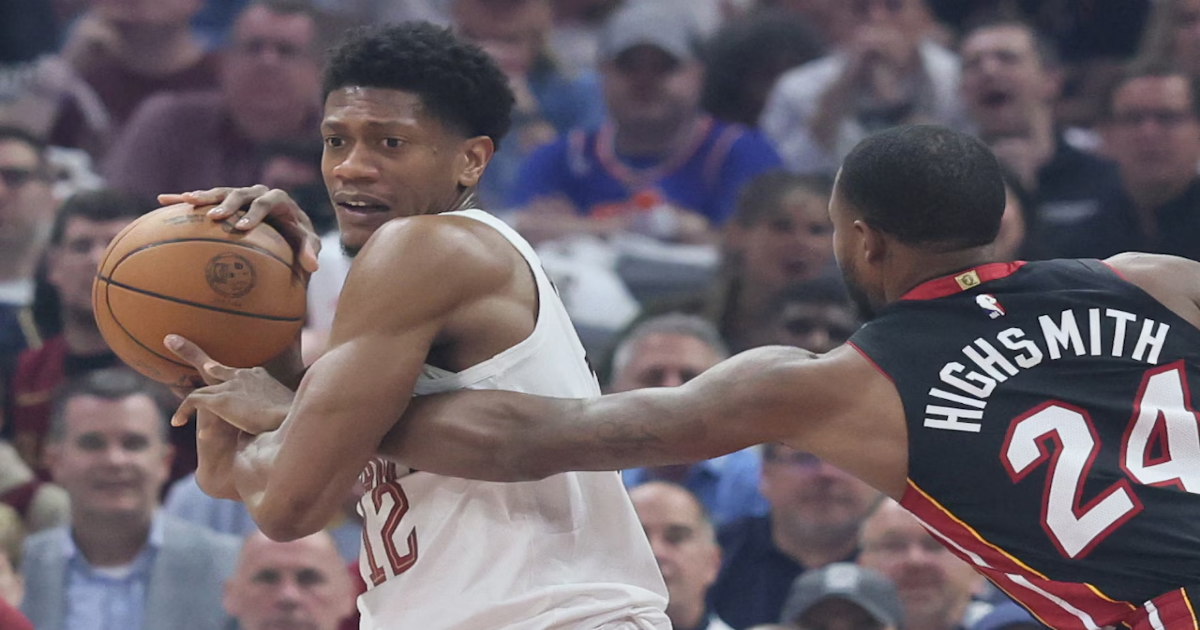 Cleveland Cavaliers forward De’Andre Hunter secures a rebound from Miami Heat forward Haywood Highsmith in the first half of the NBA Playoffs at Rocket Arena.