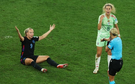 Referee Ivana Martincic points to the penalty spot after Beth Mead of England is fouled by Emma Severini of Italy. Photograph: Alexander Hassenstein/Getty Images