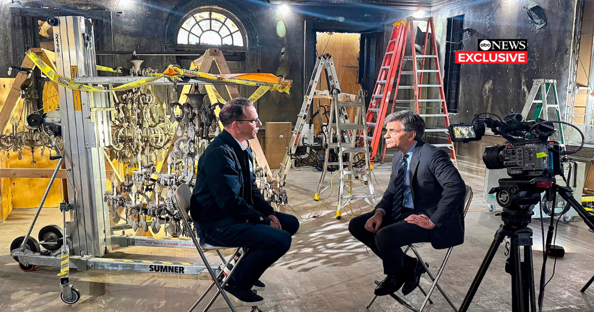 The governor spoke with Stephanopoulos from one of the fire-damaged rooms at the governor’s residence in Harrisburg on Thursday. For the first time together, the governor and first lady Lori Shapiro also toured the damage, along with Stephanopoulos.