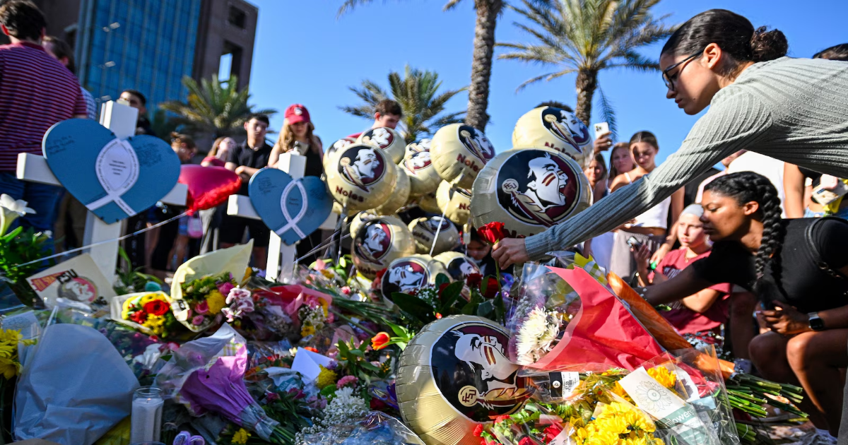 Students hold a vigil near the scene of a mass shooting near the Florida State University student center, April 17, 2025, in Tallahassee, Florida.