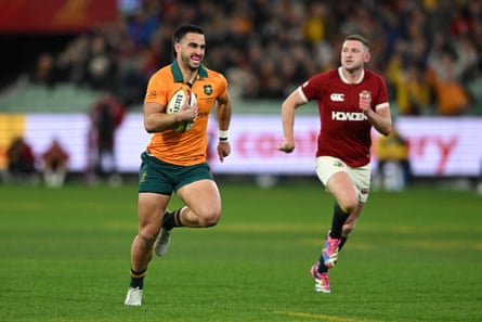 The Wallabies’ bravery was evident in the forwards’ courage and the backs’ appetite for risk. Wright was daring with his running, at one point dancing past two onrushing Lions to put Tate McDermott into space on the short side, then on the next phase finding a 50:22. The full-back still looked for advantage into the last 15 minutes with the Wallabies holding on, when he ran onto a looping Tom Lynagh pass in the backfield and sent Max Jorgensen scurrying up the touchline.