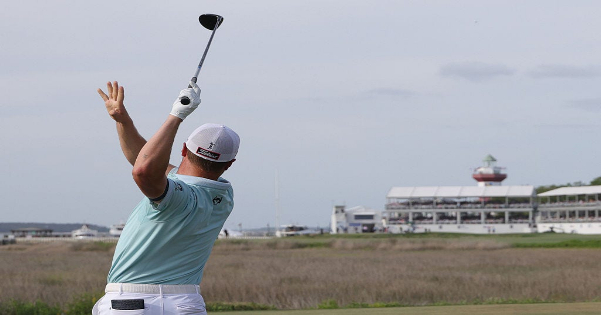 Justin Thomas follows through on his drive at the 18th hole of the Harbour Town Golf Links on April 20 during the final round of the PGA Tour’s RBC Heritage.