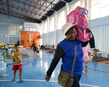 Evacuees carry their belongings at a Thai government evacuation centre after clashes in Surin province, Thailand, on Thursday. Photograph: Kaikungwon Duanjumroon/EPA