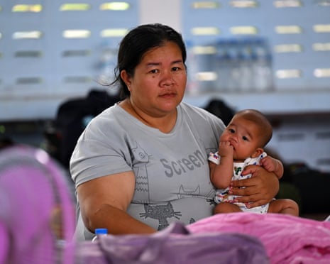An evacuee holds her baby at a Thai government evacuation centre after being relocated following clashes in Surin province, Thailand, on Thursday. Photograph: Kaikungwon Duanjumroon/EPA