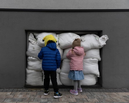Children look at sandbags covering the windows at a preschool in Lviv, Ukraine. Photograph: Joe Raedle/Getty Images