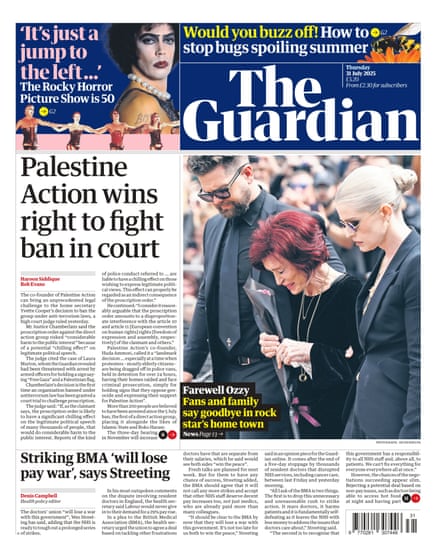 The Guardian leads with “Palestine Action wins right to fight ban in court”. The Times has “Palestine vow breaks law, claim top lawyers”, while the Mail follows the same story with “Shame on you, Starmer”. The i reports “UK plan to get aid trucks into Gaza – as Starmer joins allies in new warning to Israel”.