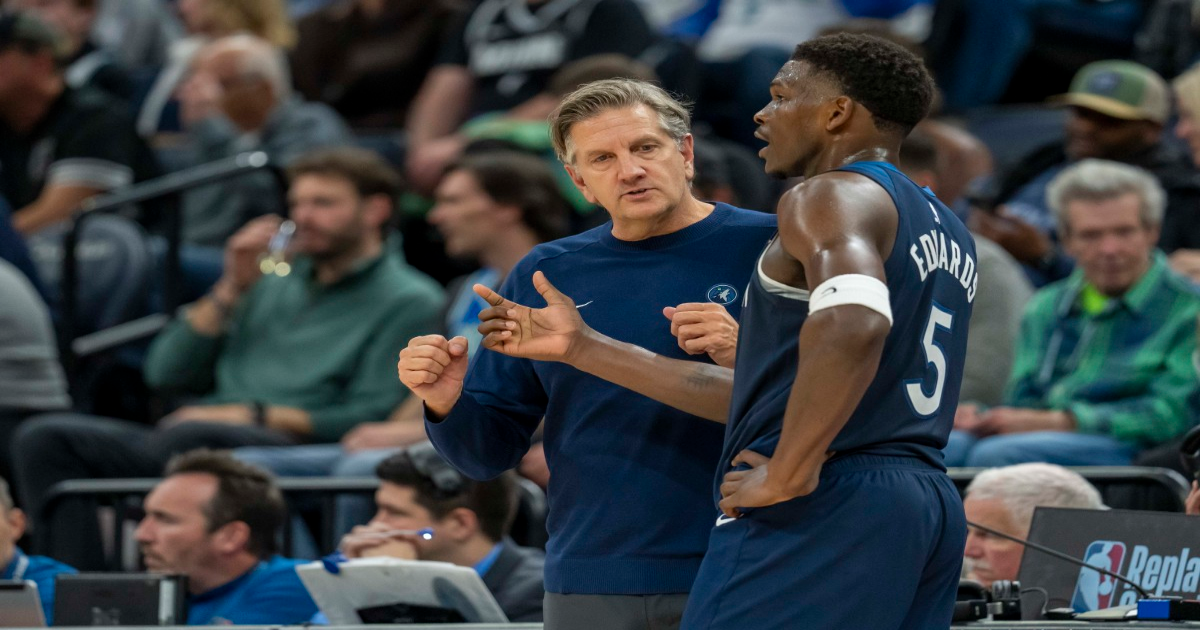 Minnesota Timberwolves head coach Chris Finch talks with Minnesota Timberwolves guard Anthony Edwards