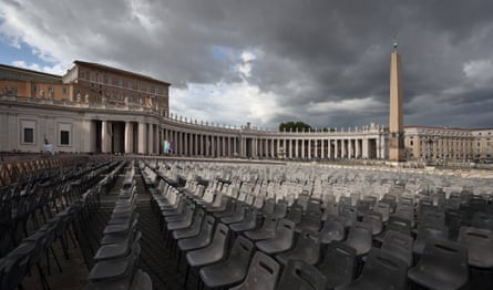 The pope’s coffin was set before St Peter’s altar for his three days of lying in state, with Francis dressed in his papal vestments – a red chasuble, white mitre and black shoes.