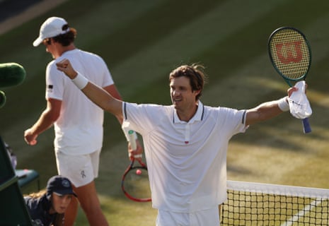 Poland’s Kamil Majchrzak is two sets up against Arthur Rinderknech, the conqueror of Sacha Zverev in the last round. Majchrzak had never won a singles match here before this year and in his grass-court warm-ups, he went out in the first round in Birmingham, Ilkley and Eastbourne. Then he turned up here and beat the former finalist Matteo Berrettini.