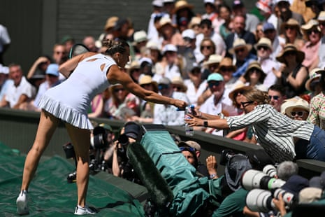 Aryna Sabalenka gives water to a member of the crowd in distress due to the heat. Photograph: Glyn Kirk/AFP/Getty Images