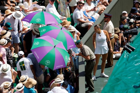 *Sabalenka 2-3 Anisimova Sabalenka goes long for 0-15, then a double ups the ante; she takes her time after sending down a third consecutive fault and her her delivery sits up and begs to be spanked; Anisimova will be disappointed she hits the net on return. But have a look! She cracks a backhand winer cross, raising two break points, and this feels like a potential inflection point, but a return into the net and a forehand that’s just long bring us to deuce, Anisimova slipping on to haunches in frustration as the missed opportunity. So to deuce we go, at which point there’s a pause as someone in the crowd has a situation; Sabalenka takes over some water, then both players sit under their respective umbrellas, left in limbo at a pressure moment. That’s better news for Anisimova, able to relax while her opponent stews.